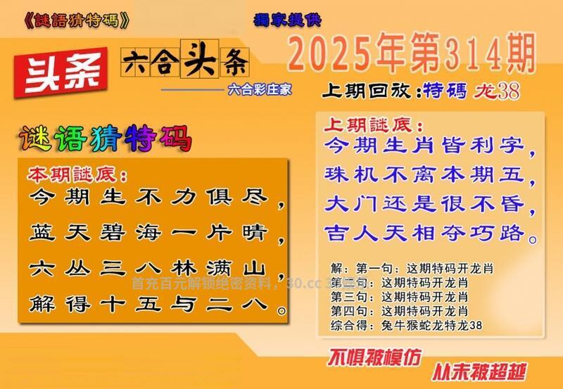314期 今期生不力俱尽 蓝天碧海一片晴 六丛三八林满山 解得十五与二八 解译:蓝天碧海一片晴指天肖牛马龙兔猴猪,六丛三八林满山指山肖鼠虎兔羊猴鸡猪 九肖:牛马鼠虎兔羊猴鸡猪 六肖:牛马鼠虎兔羊 特码:17.29.24.36.18.30.16.28 15.27.23.35.22.34.21.33 |